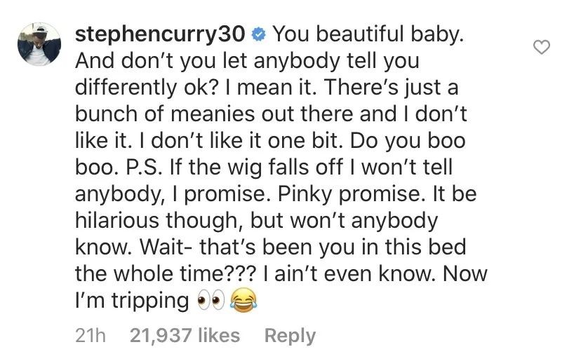 平时阿耶莎发布的照片下仅有几百条评论,而这条状态下的评论却达到近两万条。由于吐槽太多,阿耶莎也解释,这只是添加了假发滤镜。老公库里更是坐不住了,在评论区发长文力挺妻子,“我美丽的宝贝。不要让任何说你不同的人影响到你。评论区里有一群杠精,我真是太不喜欢他们了,你只要做自己就好。另外,我保证,如果假发掉了,我是不会告诉任何人的。虽然会很搞笑,但没人能知道。等一等,所以一直躺在这张床上的人是你???我竟然不知道,我晕”。