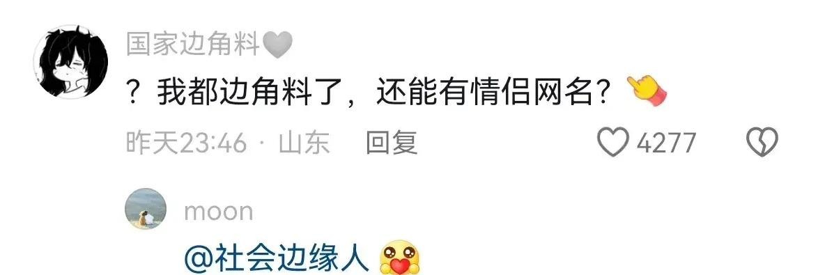 除了以上的情侣网名,还有一些网友起得更加有趣和另类。比如,《国家边角料了》和《社会边缘人》,这两个网名展示了他们对社会现象的思考和对自我身份的反思。