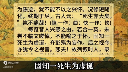 每览昔人兴感之由,若合一契,未尝不临文嗟悼,不能喻之于怀。故列叙时人,录固知一死生为虚诞,齐彭殇为妄作。吊卅殊车巳所以业怀,后之视今,亦犹今之视昔。悲夫,故列叙时人,录其所述。虽世殊事异,所以兴怀其致一也。后之览者,亦将有感于斯文。