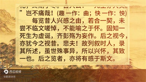 夫人之相与,俯仰一世,或取诸怀抱,悟言一室之内;或因寄所托,放浪形骸之外。虽趣舍万殊,静躁不同,当其欣于所遇,暂得于己,快然自足,不知老之将至。及其所之既倦,情随事迁,感慨系之矣。向之所欣,俯仰之间,已为陈迹,犹不能不以之兴怀。况修短随化,终期于尽。古人云:"死生亦大矣。岂不痛哉!(趣一作:曲;快一作:快)
