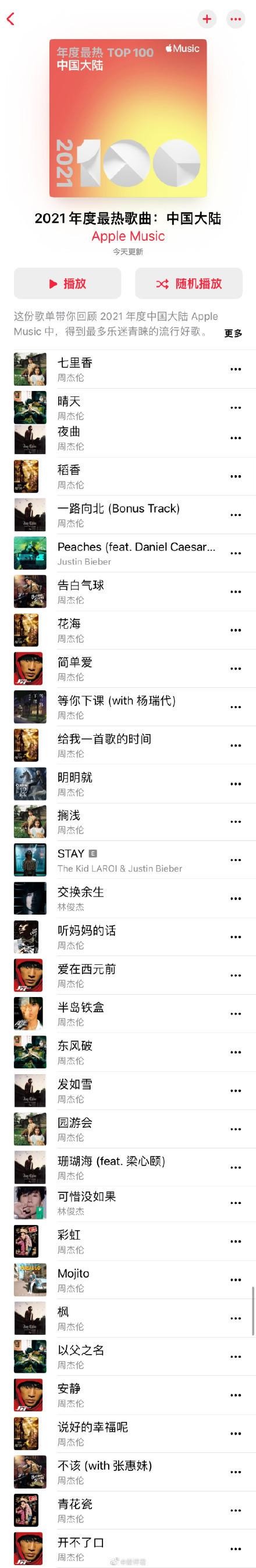 这两天王力宏的瓜相信让很多人都吃麻了,随着罗志祥、李云迪、王力宏等人的人设相继崩塌,不少人调侃说自己的歌单现在是越来越薄了。但好在还有一个热衷喝奶茶的周杰伦依然屹立不倒,2021年12月Apple Music更新了2021年度中国大陆最热歌曲榜单,前100名周杰伦占据54席,堪称真正的华语乐坛“半壁江山”。