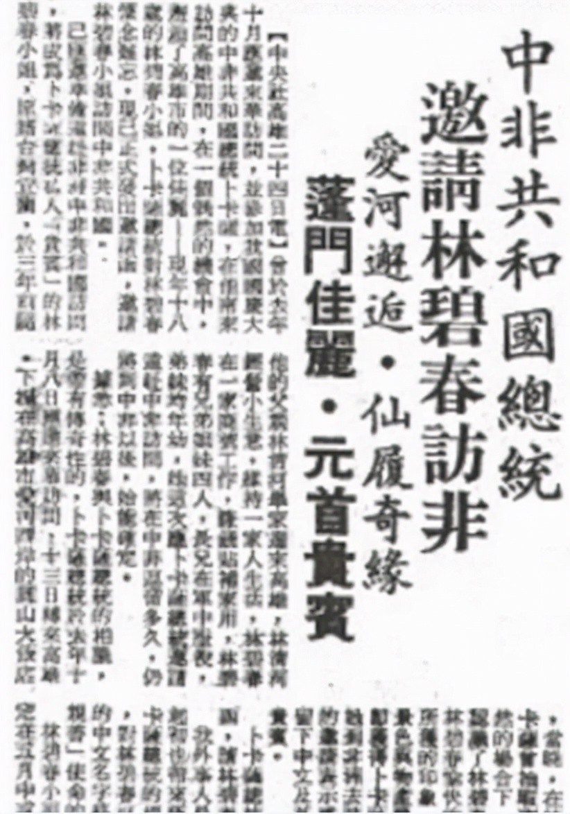 1968年,正值青春妙龄的林碧春在台湾圆山酒店做服务员,当时台湾当局邀请非洲总统博卡萨来台访问,博卡萨欣然同意。