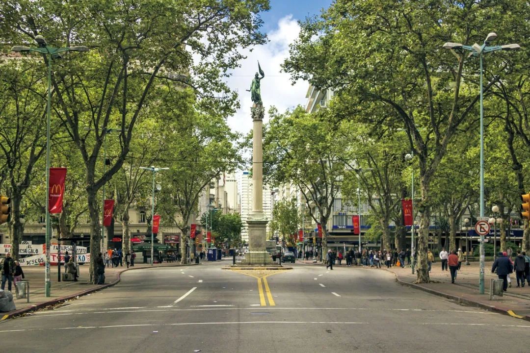 独立广场的西端是7月18日大道的起点,这条贯穿新城区的主干道因1830年乌拉圭宪法的颁布日期而得名。每年狂欢节的开幕游行都在这条大道上举行。沿大道东行,每隔三五个街区就有一座小广场或街心花园,绿草如茵,遍植鲜花。老人时常汇聚于此,伴着探戈舞曲翩翩起舞。