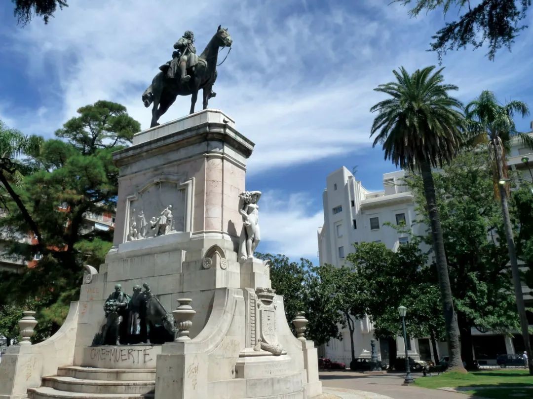 18世纪老城区御敌的堡垒,如今只剩下一道拱门。穿过这座城堡之门(Puerta de la Ciudadela)就进入了新城区。象征着民族尊严与荣耀的独立广场(Plaza Independencia)建立在旧殖民地的残骸之上,中央矗立着乌拉圭国父何塞·赫瓦西奥·阿蒂加斯(José Gervasio Artigas)的青铜雕像,他曾作为西班牙轻骑兵抵抗葡萄牙和英国军队的入侵,却在1811年毅然放弃了殖民者军官的职务,带领乌拉圭河东岸爱国军发起了轰轰烈烈的独立战争。尽管时局不利,5年后葡萄牙再次将乌拉圭并入巴西,阿蒂加斯被迫流亡他乡,但他未竟的革命事业却得以薪火相传。1825年8月25日,以胡安·安东尼奥·拉瓦列哈(Juan Antonio Lavalleja)为首的“东岸三十三人起义团”(Treinta y Tres Orientales)收复了蒙得维的亚城,举起写着“自由或死亡”的旗帜,宣告乌拉圭独立,这一天成为了乌拉圭的国庆日,“33”也因此成为意义非凡的数字。乌拉圭有个三十三省,蒙市也有座东岸三十三人广场,广场周围种植了33棵高大挺拔的棕榈树,无声地守卫着这个国家,一如往昔。虽然这33名东岸人的姓名已难以全部考证,但人民并没有忘记他们。