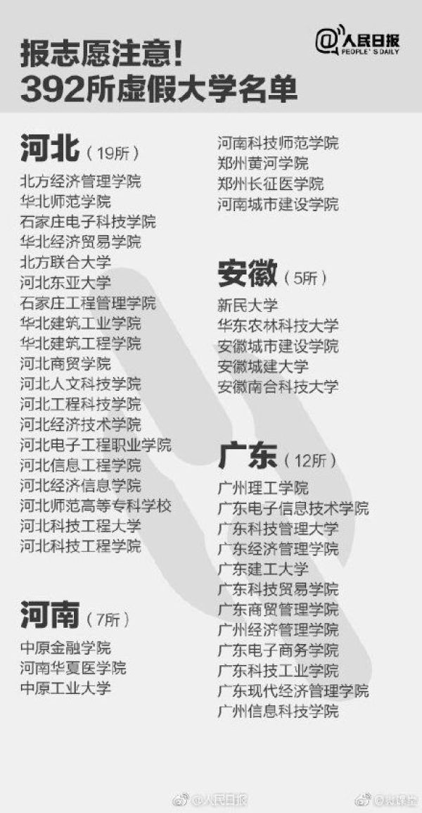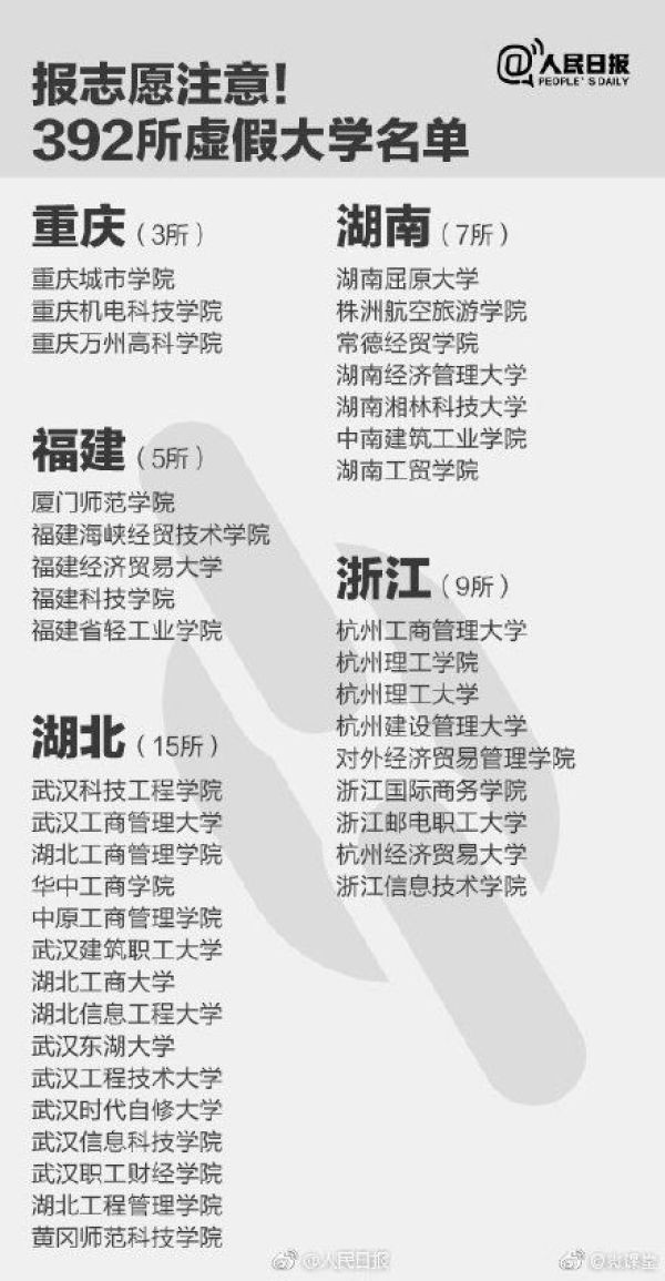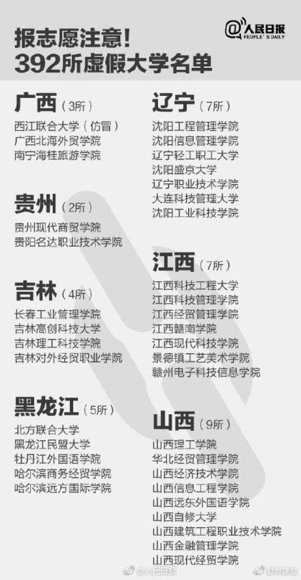 【速扩散!全国392所野鸡大学曝光,北京成重灾区】马上要报志愿了,考生们一定要警惕这些虚假大学陷阱!这些学校部分仿冒正规高校的校名,学校简介多是抄袭拼凑而成,部分“野鸡学校”被曝光多次仍换个域名继续存在。别上当!@人民日报