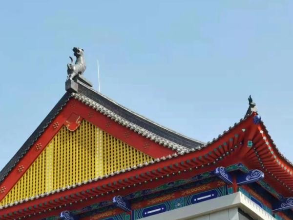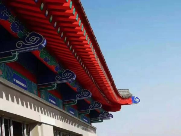 立面屋檐以红色、绿色为主色调,