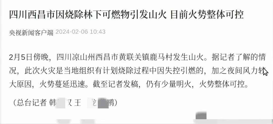 人们开始质疑这场火灾是否与当地政府有计划的烧山行为有关。央视报道指出,这场山火是当地有计划的烧除杂草等可燃物引发的,然而由于晚上风力大,火势逐渐失控。人们开始怀疑,这个原本旨在防火的计划,是否真的安全可靠?
