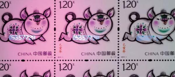 ↑《己亥年》生肖邮票版张上的每一枚邮票,都印有与邮票版张序列号码相同的无色荧光号码。