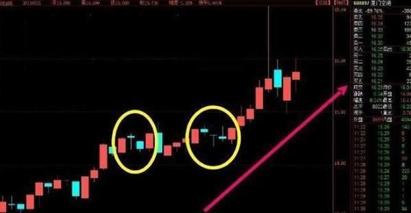 在上升趋势中,出现一根长阳线,在此长阳之后,出现一群实体短小的阴阳线,显示先前趋势所面临的一些压力。一般而言,这些盘整的线形大多为阴线,但 最重要 的一点是,这些线形的实体必须处在第一天长阳线的高、低价范围内,包括影线在内。最后一根阴阳线(通常为第五天)的开盘价位于前一天收盘价之上,并且收盘价创出新高。