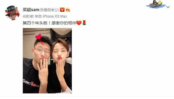 27日晚,买超也在网上晒出一张和张嘉倪秀恩爱的合照,还写道:“第四个年头啦!感谢你的相伴”。原来今天不仅是买超生日,还是他与张嘉倪结婚四周年纪念日,真是太有意义了。