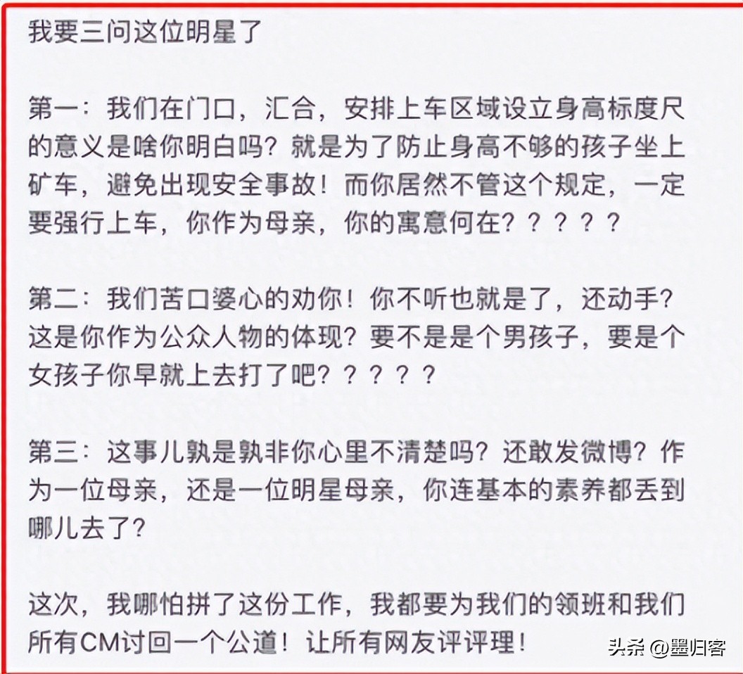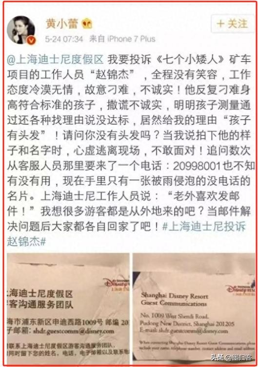 这件事原本是没有多少人知道,但黄小蕾在回家后大概觉得这件事让自己女儿受委屈了,便在社交账号上吐槽自己这次去迪士尼游玩时不愉快的经历。