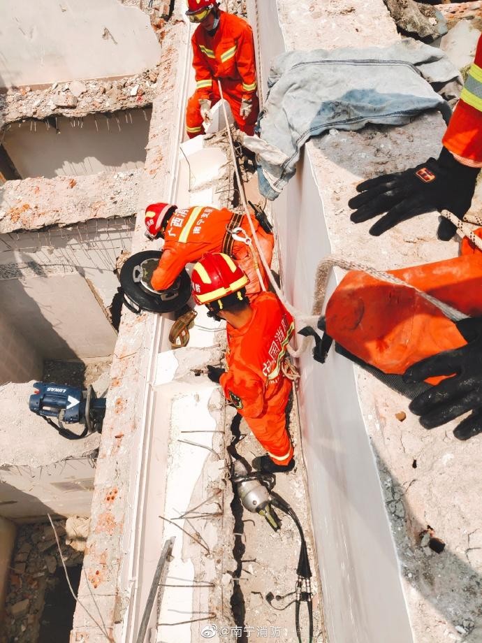 接到报警后,南宁市消防支队立即调派特勤一中队、朝阳中队、江南中队、新阳中队出动四个救援编队赶赴现场救援。到现场勘察得知,是房屋拆迁现场横梁坍塌,3人被困,消防人员立即展开救援,经消防员使用液压扩张器对房梁进行顶撑,10时25分第一名尚有意识的被困人员救出,11时20分3名被困人员全部救出,到17日下午6时许,事故造成1人重伤2人死亡。