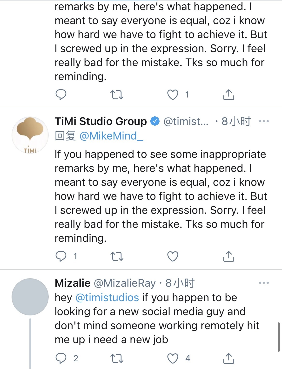 而事件的被回复者也表示接受道歉,并提醒下次不要再犯同样的错误。