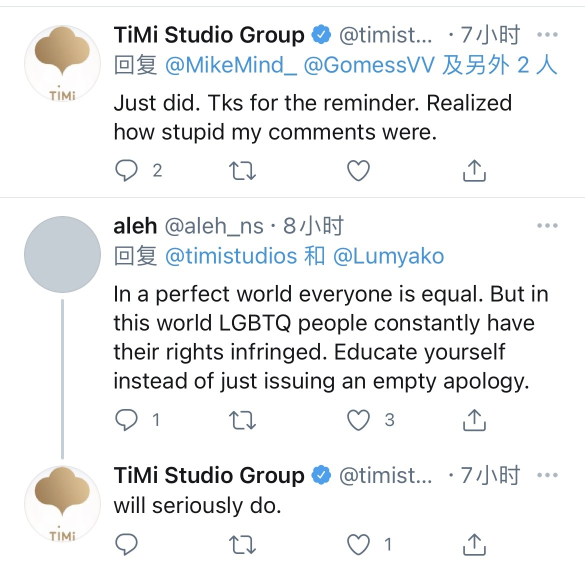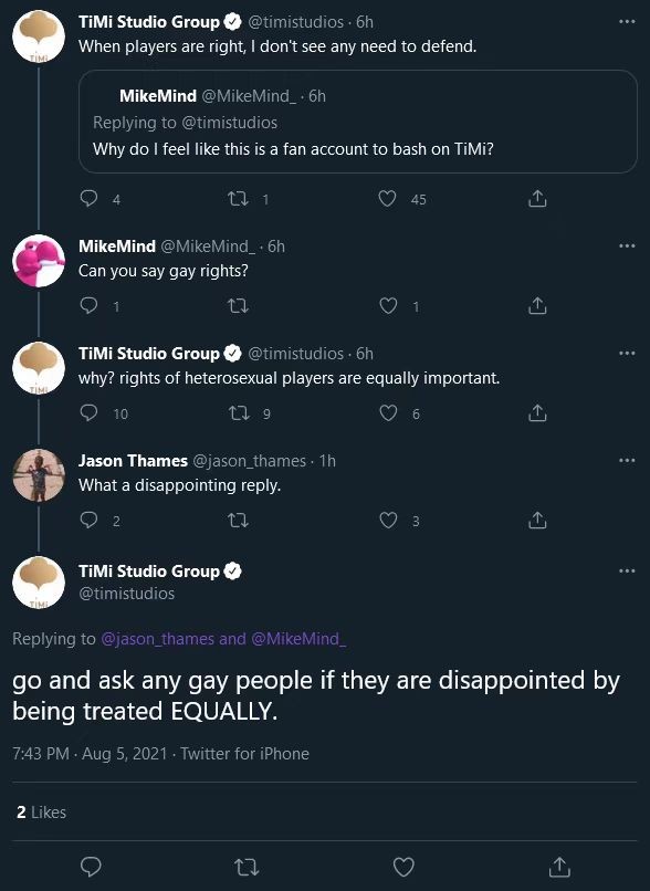 8月6日,腾讯天美工作室在twitter因回复了“why?rights of heterosexual players are equally importtant”被误解为不尊重“同性恋”权益,因此受到了大量twitter网友的质疑和批评。