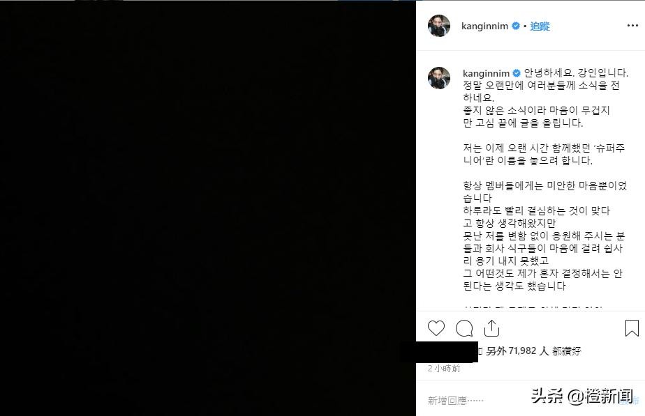 34岁韩国男团Super Junior(SJ)成员强仁曾多次爆丑闻,例如多次酒驾、涉嫌打女友等,虽然最近才再回复演艺工作,但他今早却在IG宣布退出Super Junior。