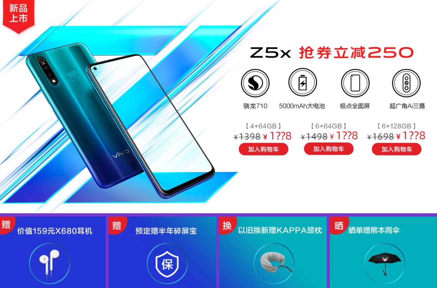 近期的优惠活动自然不止V-Card这一个,毕竟目前还处于618年中大促期间,vivo针对618也展开了活动,旗下多款机型都有一定的优惠力度。近期最受关注的机型莫过于新品vivo Z5x了,本身1398元的起售价就相当具有吸引力,在618年中大促期间,vivo还拥有最高直降250元的优惠幅度,起售价仅需1148元,简直是一个无法拒绝的售价。
