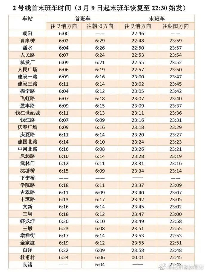 据杭州市地铁集团消息,3月9日(明天)0时起,杭州地铁各线路末班车时间恢复正常,不再延长。