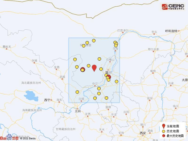 根据中国地震台网速报目录,震中周边200公里内近5年来发生3级以上地震共24次,最大地震分别是2021年11月18日在宁夏银川市灵武市发生的4.0级地震(距离本次震中112公里)和2018年12月14日在内蒙古阿拉善盟阿拉善左旗发生的4.0级地震(距离本次震中78公里),历史地震分布如图。