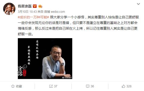 刚刚翻了一下涂磊的微博,3月10号是这样写的:无论你的话是对是错,但只要不是建立在尊重别人的基础之上,对方都会情绪反感。