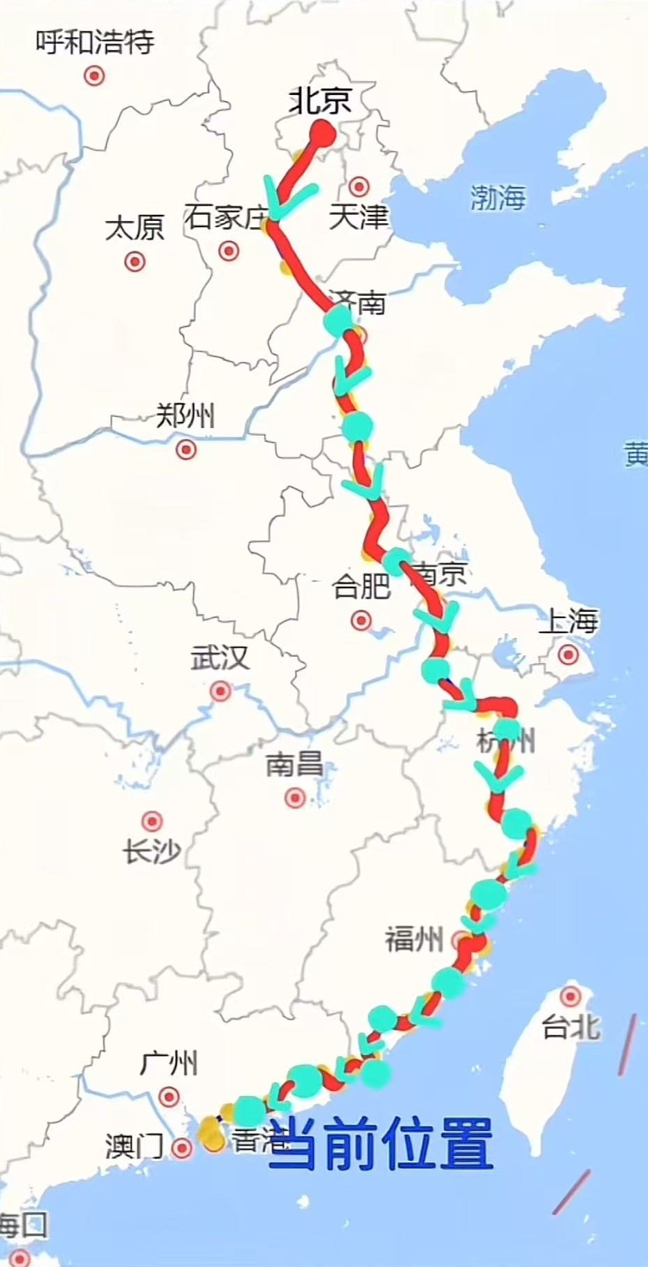 沈铁向九派新闻介绍,他是辽宁人,在山东烟台上学。这次长途旅行,将起点站和终点站定为北京和香港,是因为它们具有南方与北方城市特征。