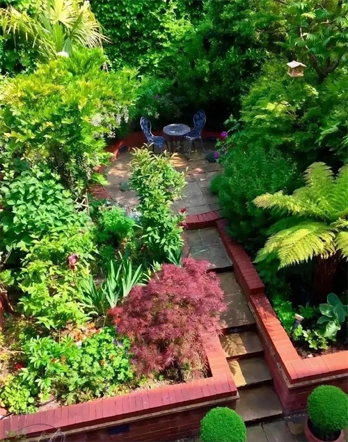 树上还有为鸟搭建的小房子,蓝色的座椅和小桌在院子的中间。