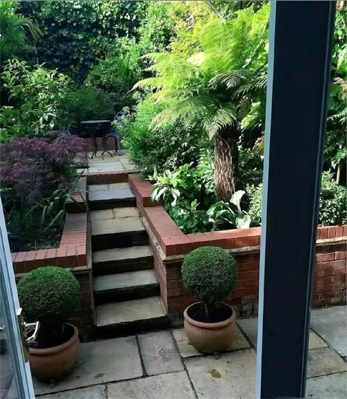 两个小小的圆型盆栽,在台阶两边十分的可爱。