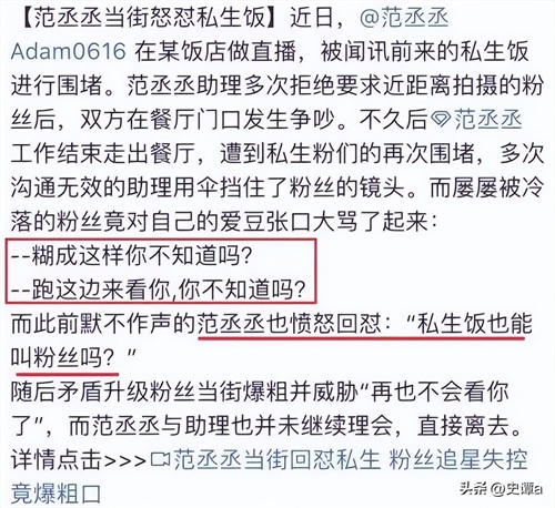 岂料这些私生粉竟然大言不惭的回答范丞丞,自己多糊自己不知道吗?好像他们的私生行为能让范丞丞的名气增加。