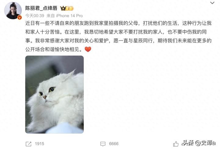 这种行为已经严重干扰她家人朋友的正常生活,陈丽君发文的目的也是希望大家能理智追星,更希望能在片场和大家交朋友。