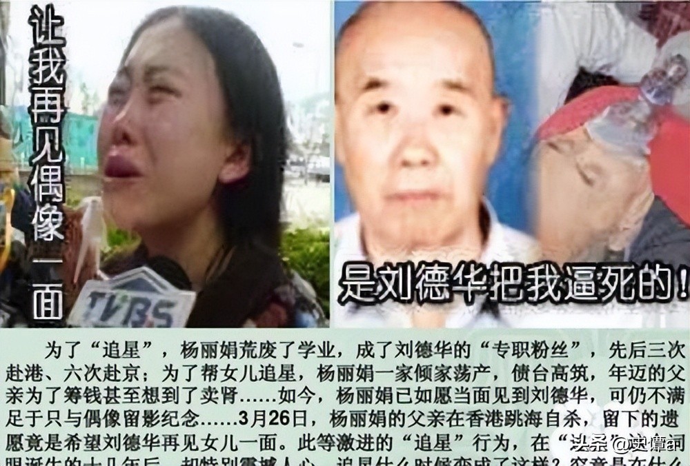 为了刘德华,她散尽家财,放弃了自己一切的正常生活,杨丽娟的父亲,对女儿爱之深,责之切,留下了一封斥责刘德华的遗书后,跳海自尽。