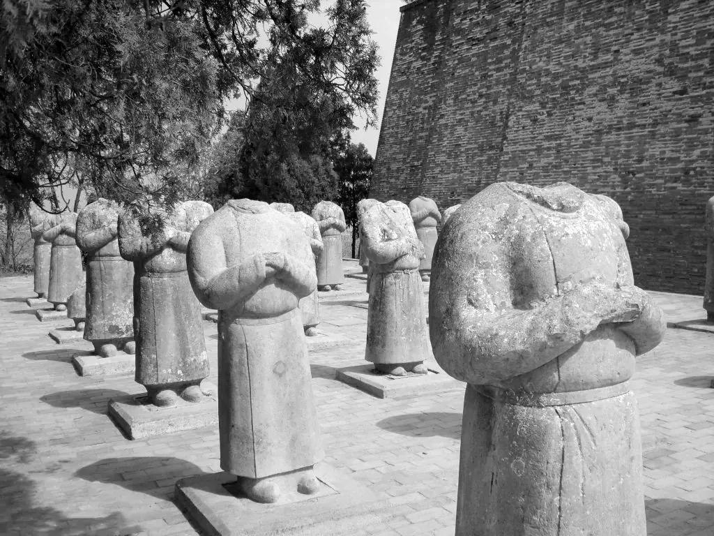 乾陵位于陕西乾县城北的梁山上,距西安80多公里,是唐朝第三代皇帝唐高宗李治与武则天的合葬陵。在乾陵陵园朱雀门外的东西两侧,分布着61尊石人像,其中东边29尊,西边32尊。石人大小和真人差不多,可惜头部早都踪影皆无,现存的石人像残高在1.5米至1.77米之间。而有专家们推断,关中大地震是造成61尊蕃臣像头部断裂的主要原因之一(其余的石像很可能毁于明末清初的战乱时期)。