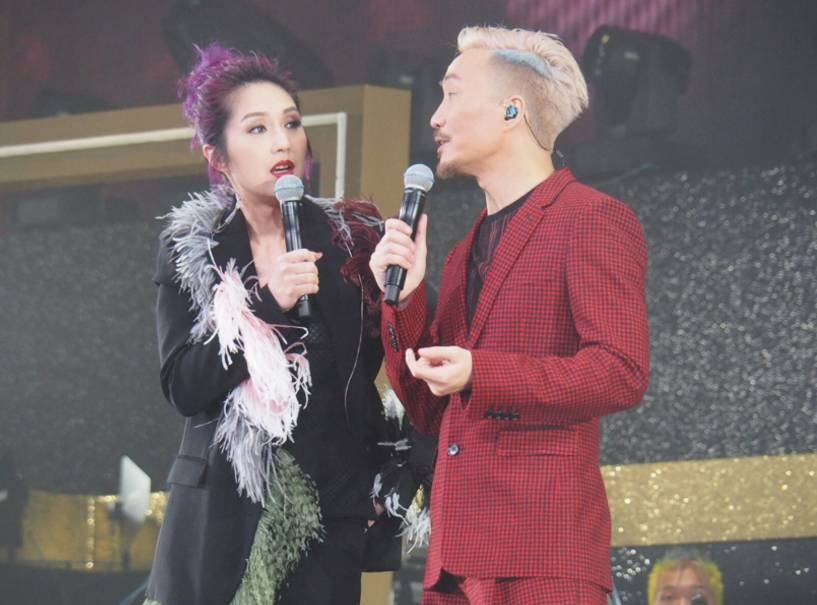 站在杨千嬅身边的郑中基手足无措,一只手拿着话筒另一只手不知该放在哪里。