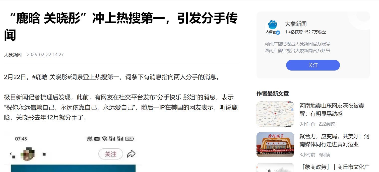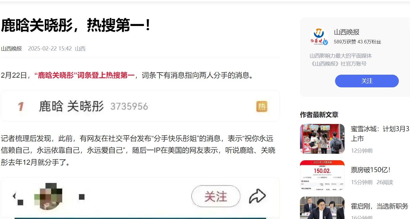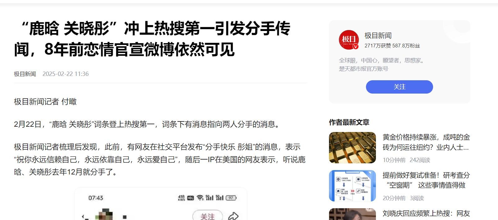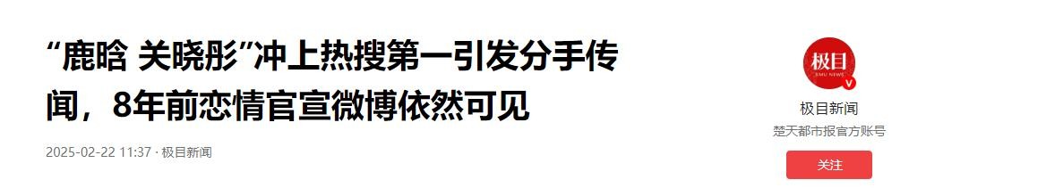 就在2025年2月22日的上午十一点,有这么一条消息突然就登上了微博热搜,鹿晗与关晓彤这对神仙眷侣,竟又被人给曝出了分手的消息。