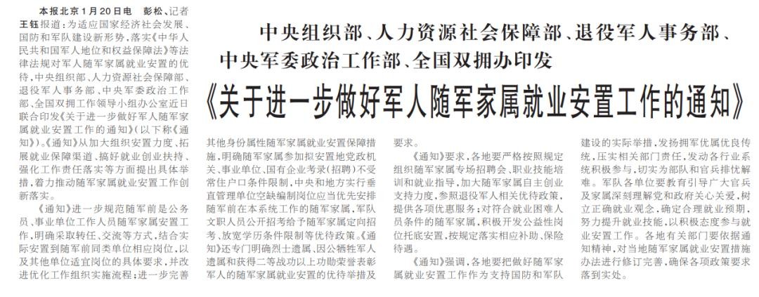 5、2022年1月,5部门联合印发《关于进一步做好军人随军家属就业安置工作的通知》,旨在进一步推动随军家属安置的落实。