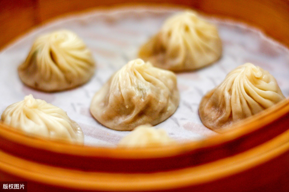 传统上海小笼,十四个褶。做这皮子,颇有些技巧,不使擀面杖,案板抹些油,上面剂子,掌心一按,皮子就成了。手上没点功夫,这“油台面”,是按不出的。皮子用中筋面粉,冷水和面,老师傅多会加些盐,或小块烫面,添些劲道。面剂子,分紧酵(不发酵)松酵(半发酵)。梅肉和馅,筋络少,肥瘦比例得当,是做馅的好料。品质要求高些的,馅儿得掺着来,多是腿肉混着五花。腿肉劲道,多则易柴;五花肉,带油脂香,松软,做馅儿易散。偏生这么一混,汁儿鲜,肉有咬劲,妙哉!小笼里的汤汁,早年用的水打的法子,纯凭鲜肉蒸出的汁,鲜得掉眉毛,只是做来繁杂,存储也难。而今多是靠皮冻出汤汁。加皮冻,讲究些,就纯用猪背皮,能出牛乳色,是顶好的皮冻,蒸出的汤汁,鲜味儿足。蒸熟后的小笼包,小巧玲珑,形似宝塔,呈半透明状,晶莹透黄,一咬一包汤,满口生津,滋味鲜美。如果吃时佐以姜丝、香醋,配上一碗蛋丝汤,其味更佳。
