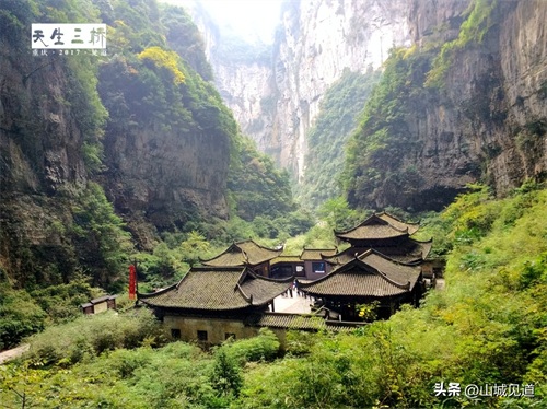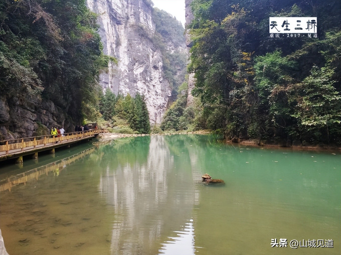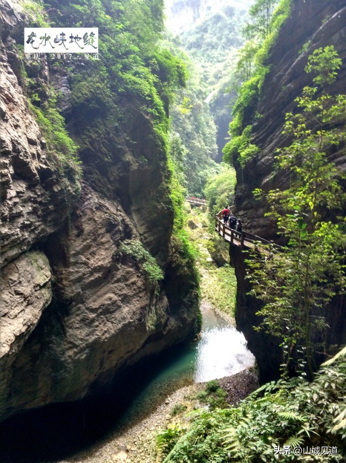 沿着步道往前不远,就能看到第二个桥--青龙桥,此时仰望四周的峭壁,就像是身处深井里。这就是二个桥之间构成的巨大天坑,名为天龙天坑。