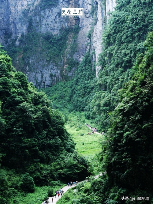 坑底有条谷底大道,很平,很宽。与其它的天坑或者峡谷不同,这里不用在岩壁上修栈道,怪不得古时会选这里建驿站。