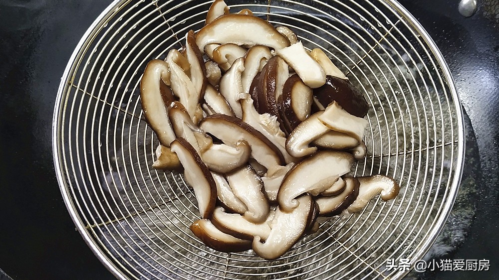 【步骤六】:同时把香菇也放入开始锅中,焯水30秒钟,稍微烫一下就可以,主要是去除香菇的异味,然后捞出来把水沥干备用。