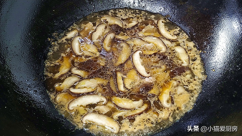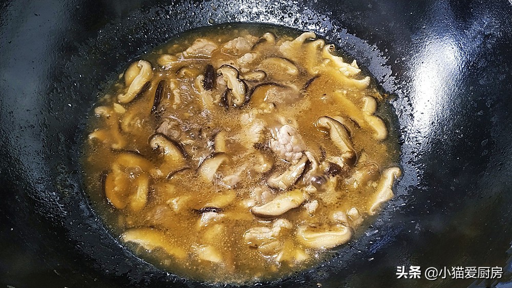 【步骤十】:放完调料后给它烧开,小火煮2分钟,让调料味道和香菇充分融合,然后把肉片到里边,同时放一勺淀粉水,大火收浓汤汁。