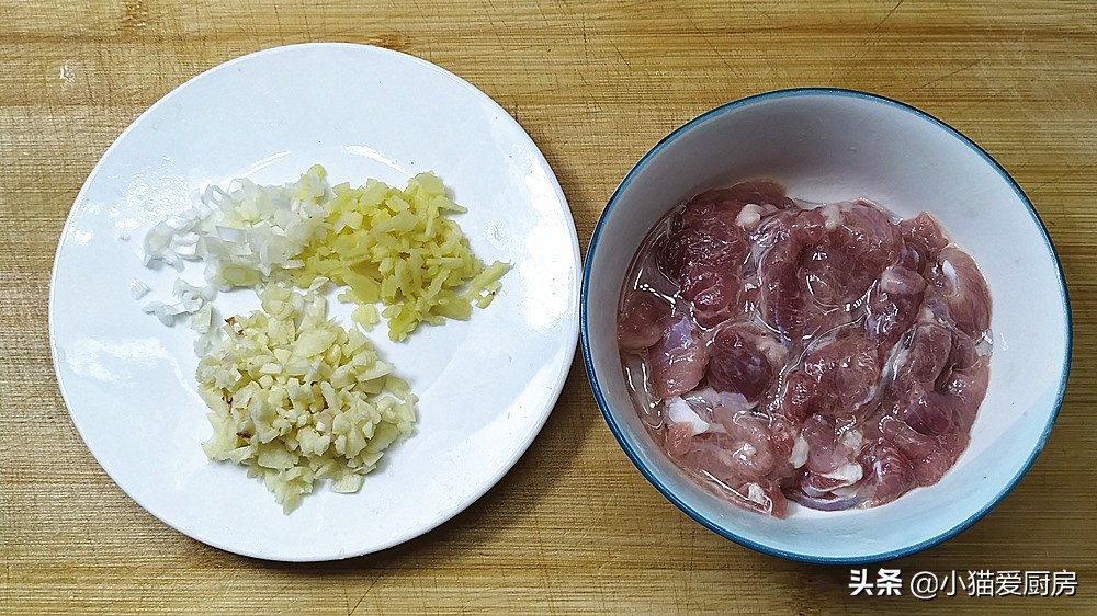【步骤三】:把准备好的瘦肉,切成片放入碗中,放入1克盐、5克料酒、淀粉2克用手抓匀后,放一勺油腌制10分钟;同时把葱姜蒜切成颗粒装盘备用。