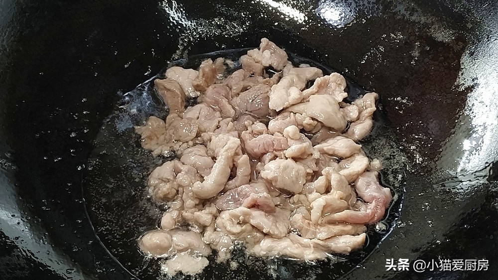 (5)炒猪肉要凉油下锅,开小火炒熟,这样可以防止猪肉粘锅,同时猪肉片也比较嫩。