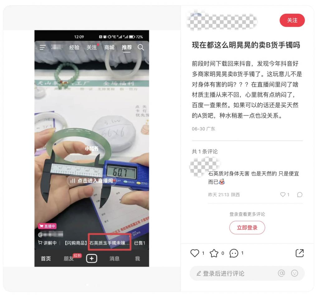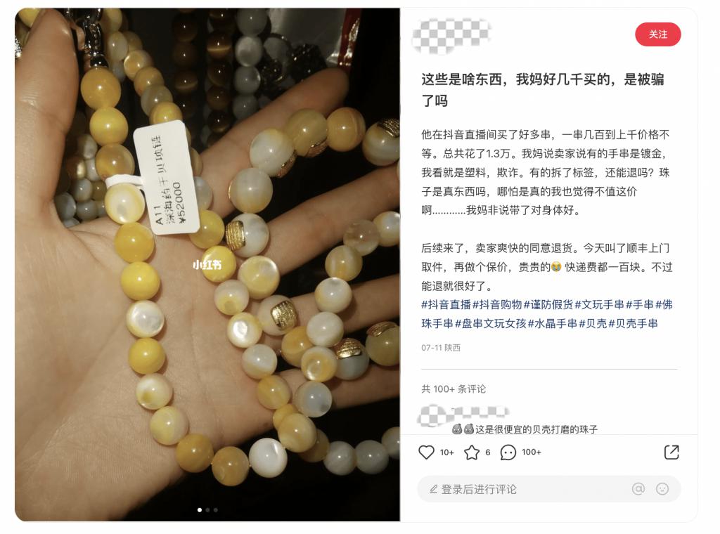 其次是信息不透明。在小红书上,也有不少网友发帖反映:抖音上的珠宝玉石产品信息通常不完善、不准确、不真实 …… 为了吸引消费者,一些商家会夸大产品的功效、品质、产地等优点,同时隐瞒产品的缺陷、瑕疵、加工方式等问题。消费者在购买时面临着信息匮乏和判断困难,容易受到误导。