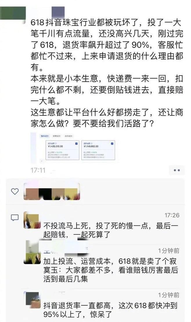 近日,一位珠宝商家在朋友圈抱怨 "618 抖音珠宝行业退货率飙升 ",不少人纷纷在评论区吐露苦水,表示 " 大家都差不多 "" 抖音退货率一直都高,这次 618 都快冲到 95% 以上 "。对于商家而言,他们花费了资金购买流量,在整个狂欢节忙碌了一番,可最终得来的却是每天无休止地处理退货单的麻烦。