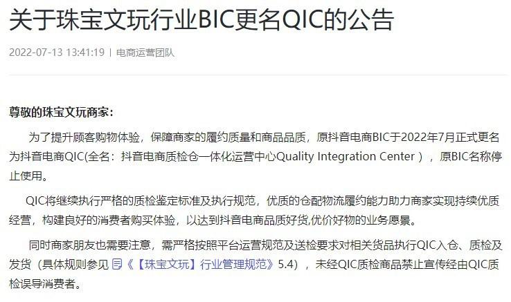 2025 年 7 月 13 日,抖音电商发布关于珠宝文玩行业 BIC 更名 QIC 的公告,公告显示,为了提升顾客购物体验,保障商家的履约质量和商品品质,原抖音电商 BIC 于 2025 年 7 月正式更名为抖音电商 QIC(全名:抖音电商质检仓一体化运营中心 Quality Integration Center),原 BIC 名称停止使用。