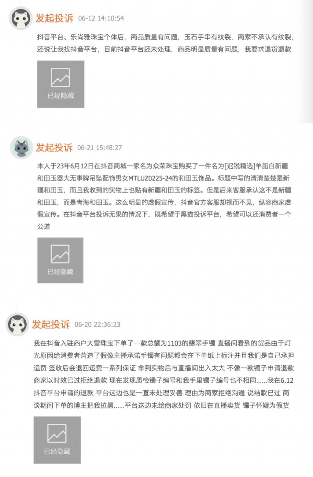 首先是假货泛滥。从黑猫投诉平台上的投诉内容来看,抖音平台上的珠宝玉石产品质量良莠不齐,甚至存在着伪劣的假冒商品。一些不良商家为了降低成本和提升利润,采用劣质或合成材料制作珠宝玉石,并使用美颜、滤镜、PS 等手段美化产品图片和视频,以此欺骗消费者。在黑猫投诉中,有不少消费者因为 " 收到货物后发现与描述严重不符 " 申请退货退款。
