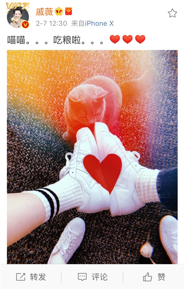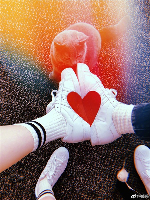 近日,戚薇在微博上发了一张一家三口穿着亲子小白鞋的照片,她和李承铉的左右脚鞋子合在一起正正好拼凑成一颗红色的爱心,她调皮的配文道:“喵喵~吃粮啦”。