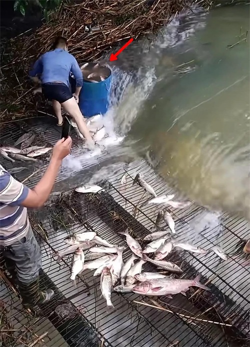 (水桶里已经装满了一水桶鱼,不停地还有大鱼冲上来,几位老乡也是开心的拍视频晒到网上。)