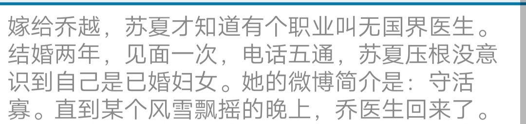 于是他们很快就闪婚了,只是婚后乔医生就因为工作出国了。乔医生之所以答应结婚是因为他觉得他们合适,苏越求婚是因为多年前他救过她。