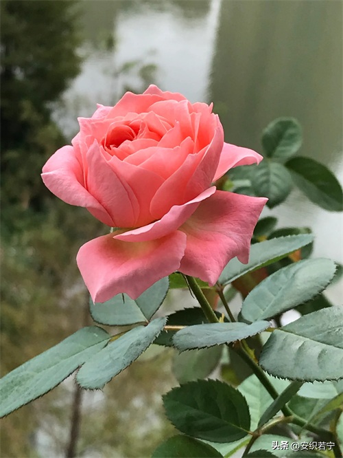 今天早晨,我照例走到阳台看我的盆栽月季花,啊,珊瑚果冻月季又开了一朵绝美的花!花还是半开的,娇艳欲滴,犹如在水一方的佳人,静静绽放在以湖水为背景的晨光中。
