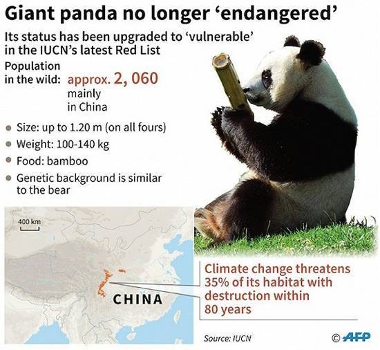 其实,早在2016年9月5日(当地时间9月4日)世界自然保护联盟(IUCN)就曾在美国夏威夷宣布将大熊猫受威胁程度由“濒危”降为“易危”