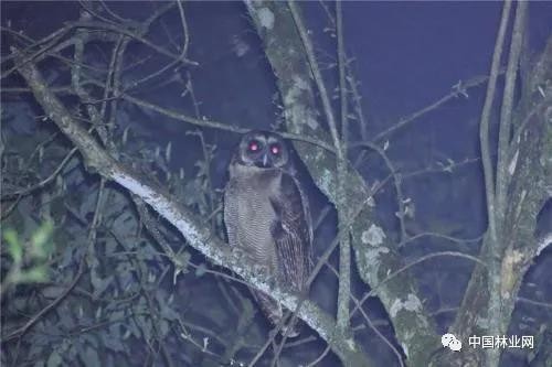 广西九万山国家级自然保护区管理中心巡护员在辖区内巡护时发现并拍摄到1只国家二级保护动物褐林鸮。这是首次在保护区内拍摄到褐林鸮。